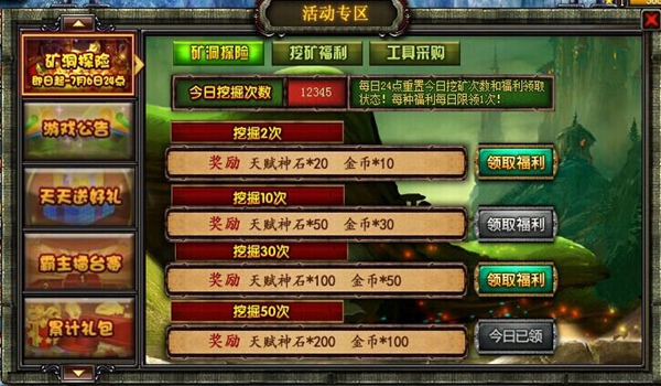3、活动期间,玩家每天挖掘宝藏的次数皆可以累积,累积后的次数能够用于兑换天赋神石及大量金币的额外奖励!